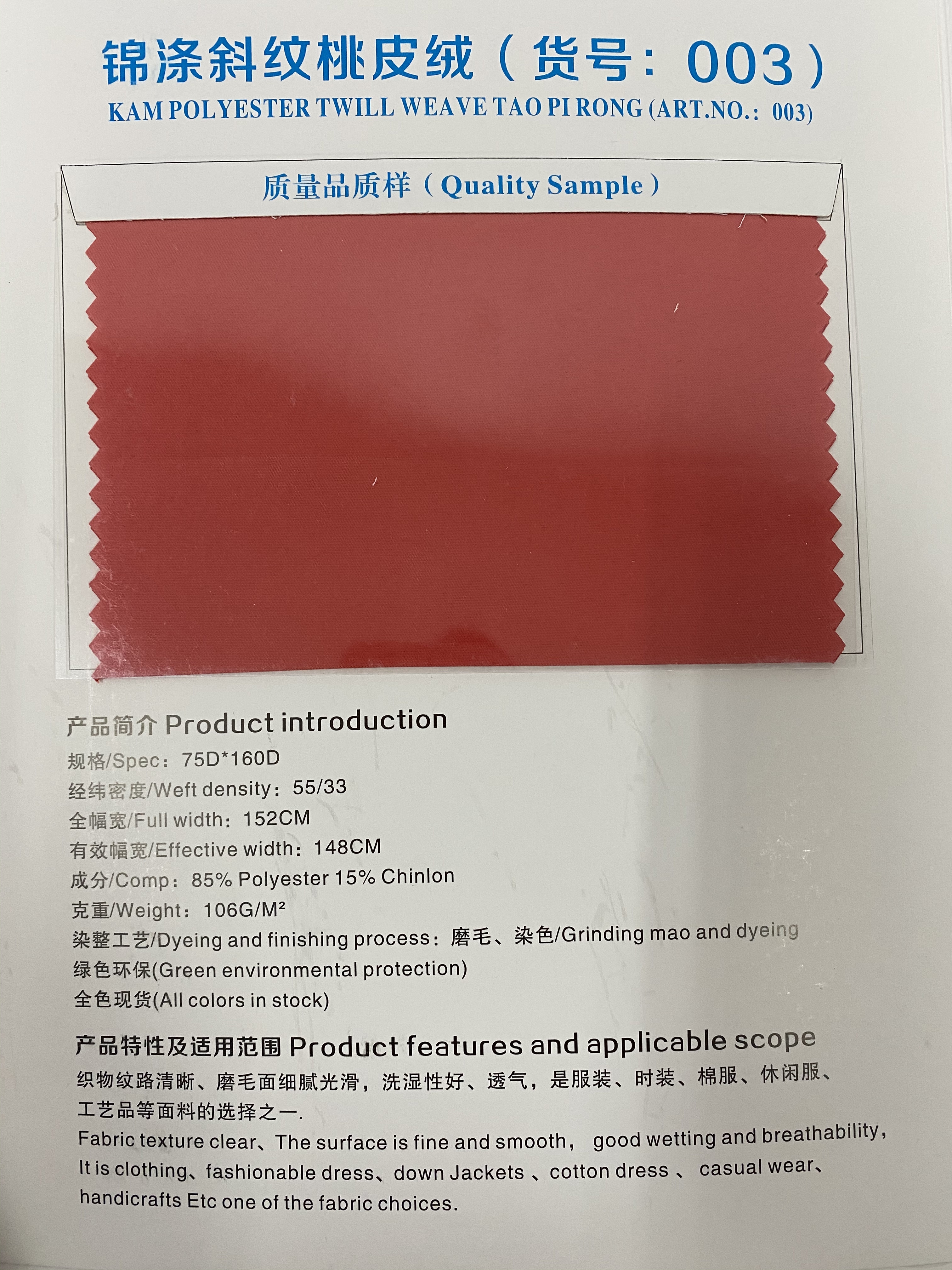 • 【產(chǎn)品名稱】:錦滌斜紋桃皮絨現(xiàn)貨